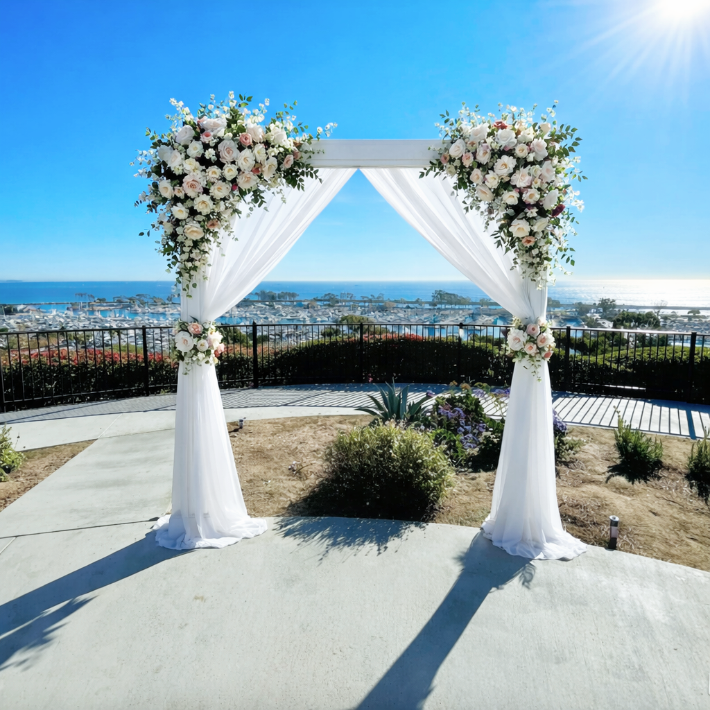 A beautifully styled ceremony arch featuring soft draping and floral accents to frame your vows and create a stunning focal point for your ceremony.